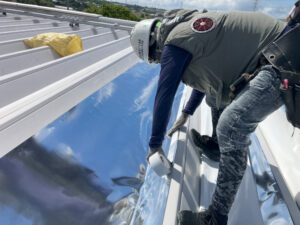 「サーモバリアスカイ工法」は屋根のジョイント部分をシートで覆うため、熱対策と同時に雨漏り対策(防水効果)も行えます。また、屋根の上での作業のみで完結するため、工場の稼働を止める必要がありません。