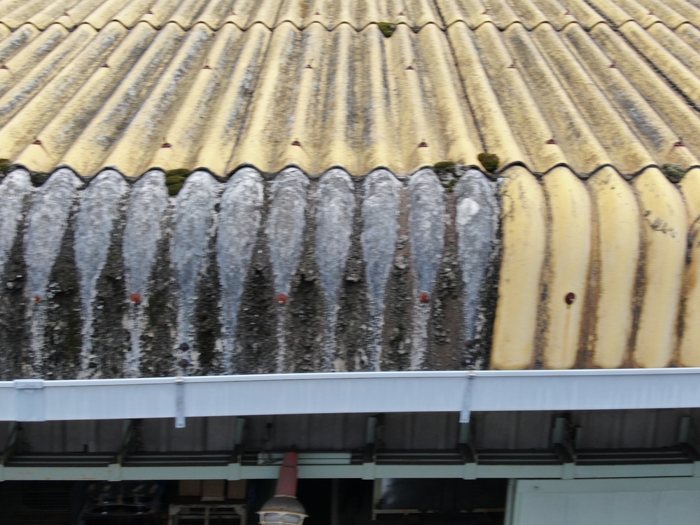 棟周辺の無着色(グレー部分)には採光スレートが使用されており、軒先のラジアル部分(R形状)にはコケがびっしりと付着しています。