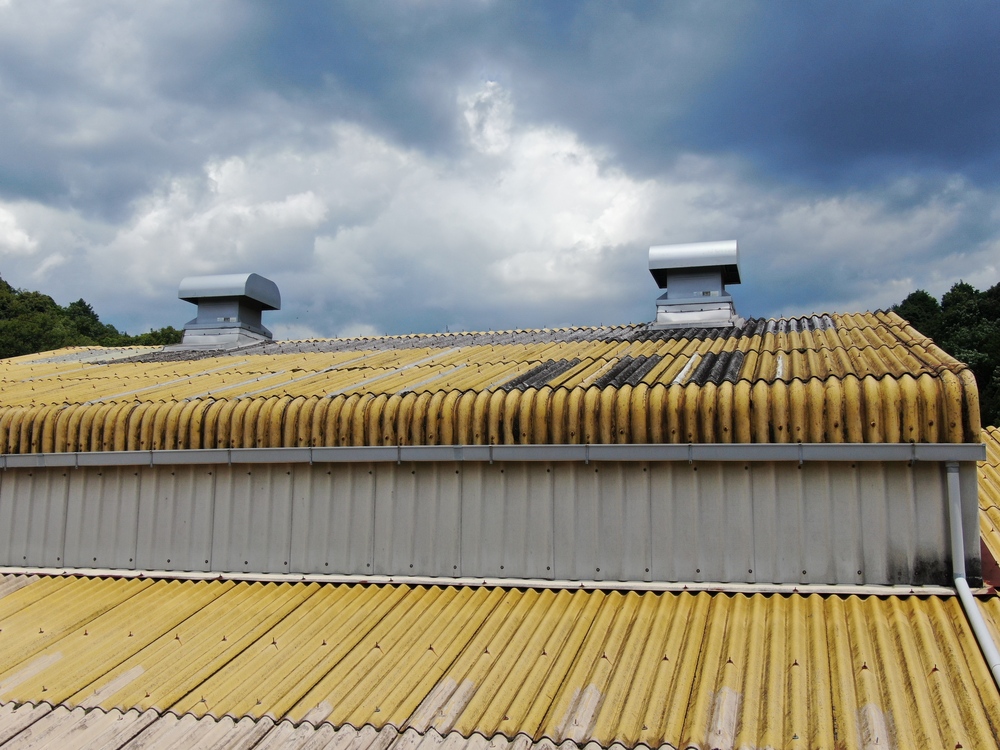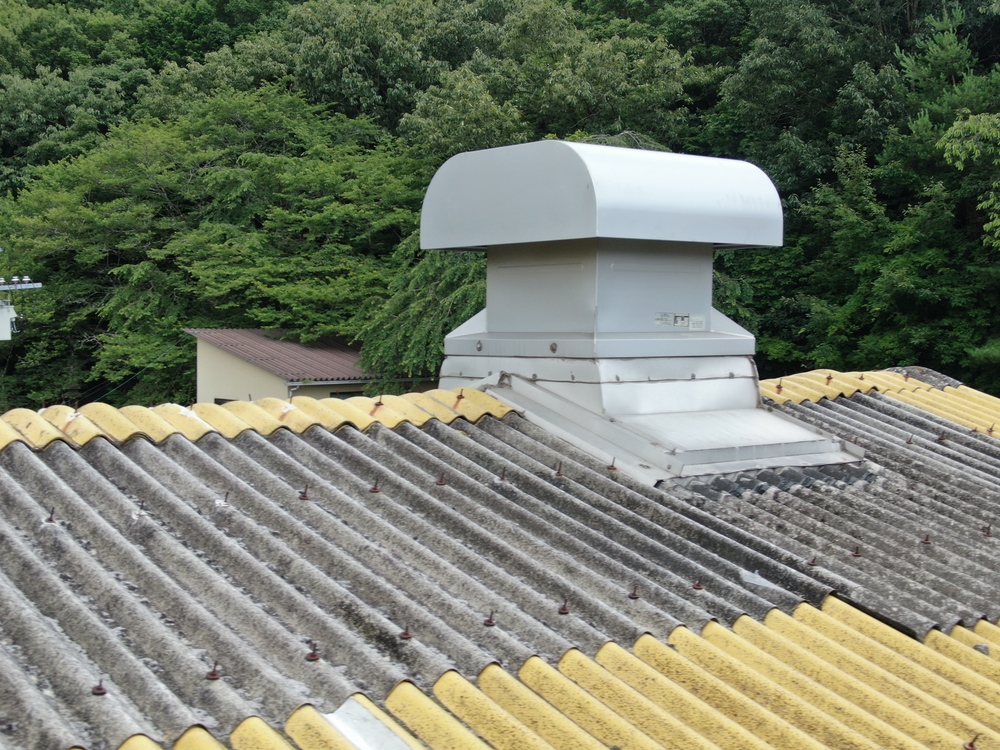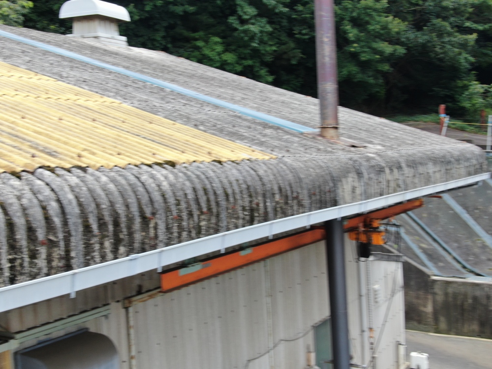屋根の劣化や雨漏りにお悩みだったため調査したところ、工場の裏側が森に面している影響で、大波スレート屋根にはコケや汚れが多く見られ、劣化が進行していました。