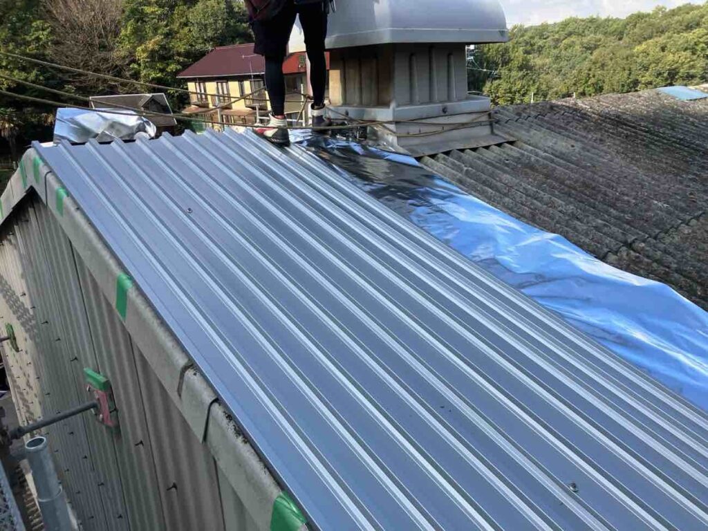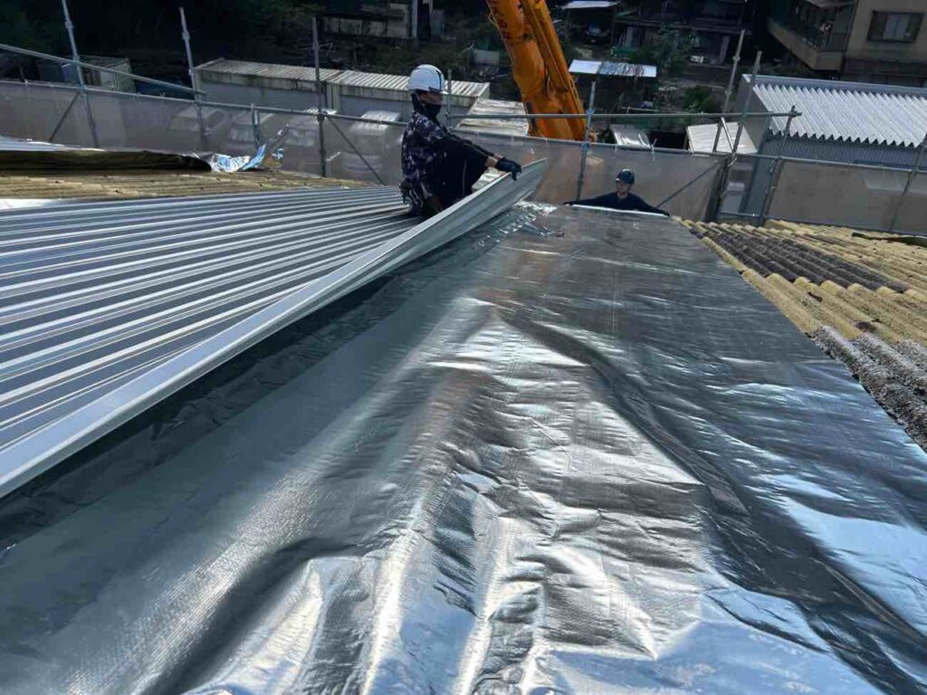 遮熱シートの上にガルバリウム鋼板『エバールーフ やまなみ1型』を丁寧に設置します。