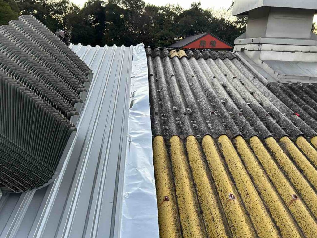 遮熱シートを敷きながら、カバールーフを載せて完成です。軒先、ケラバ、壁際、棟部に至る複雑な箇所までしっかりと施工しました。